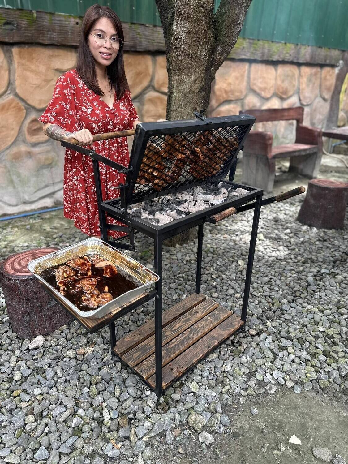 Farmhouse End Table with Charging Station, Solid Wood Nightstand with Drawer Shelf, Side Table with Pull-Out Shelf (Walnut)